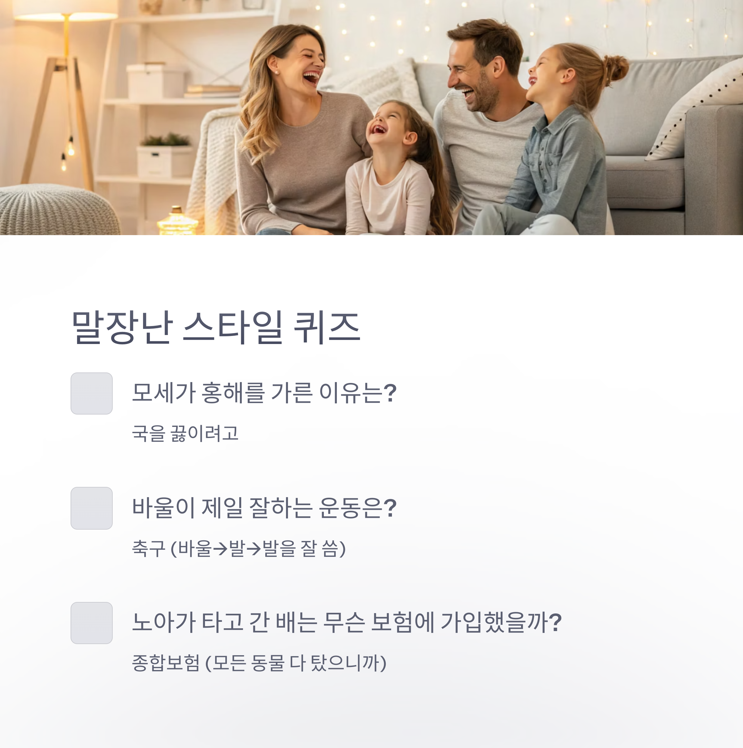 이처럼 대화체로 접근하면 가족끼리 자연스럽게 웃으며 참여하게 됩니다.