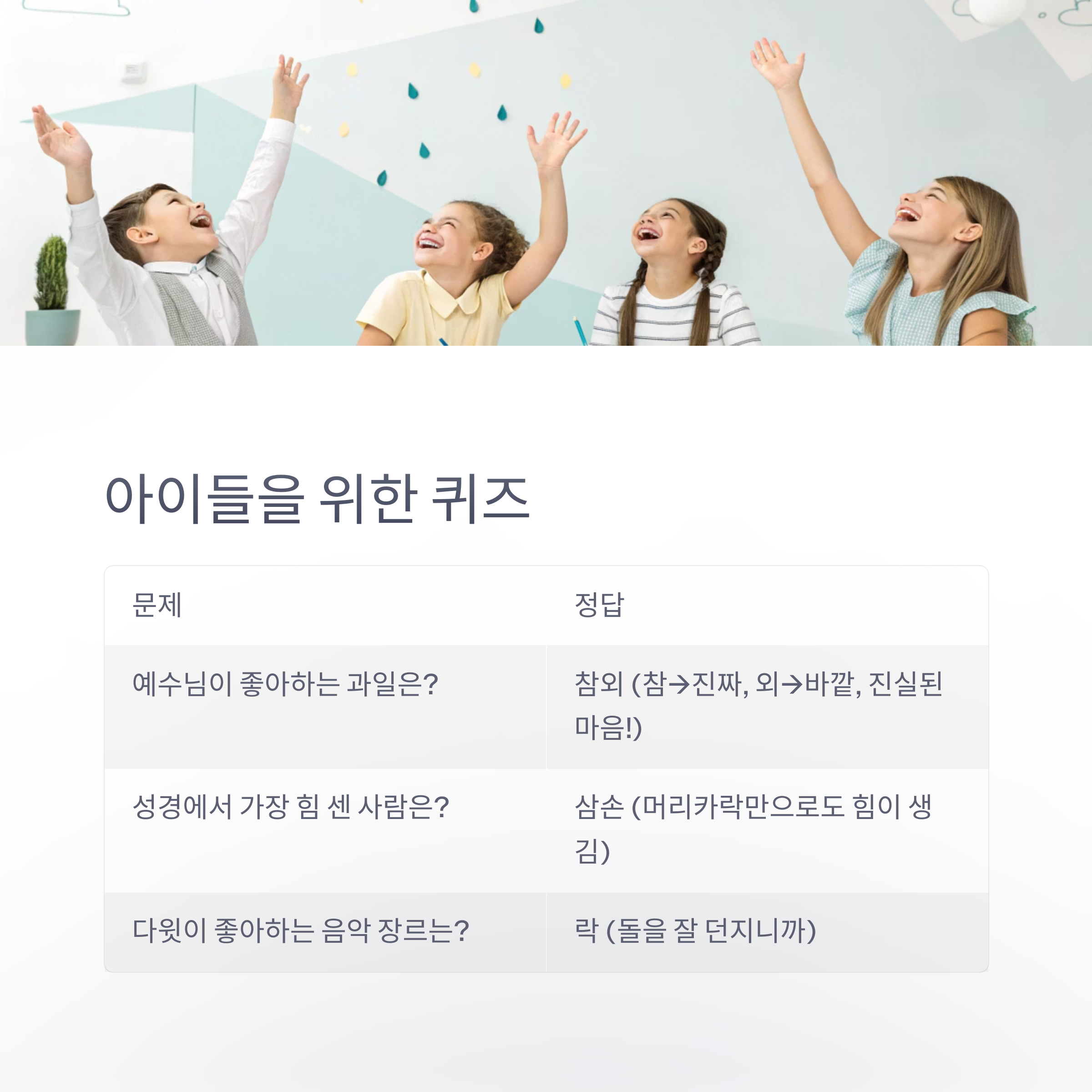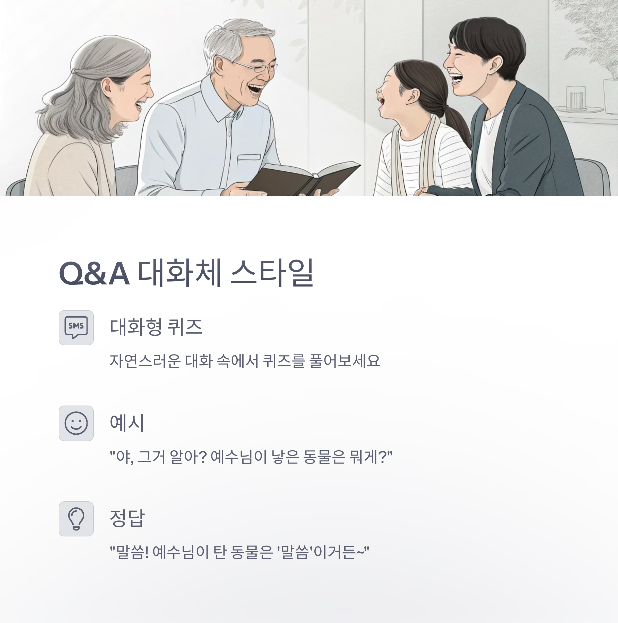 재미와 신앙을 동시에 잡는 콘텐츠로, 아이부터 어른까지 모두가 참여 가능합니다.