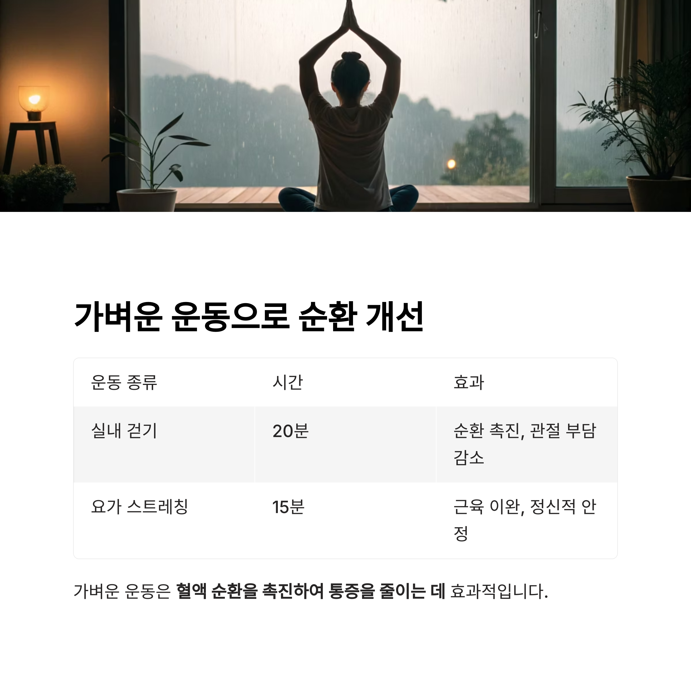 | 실내 걷기 | 20분 | 순환 촉진, 관절 부담 감소 |