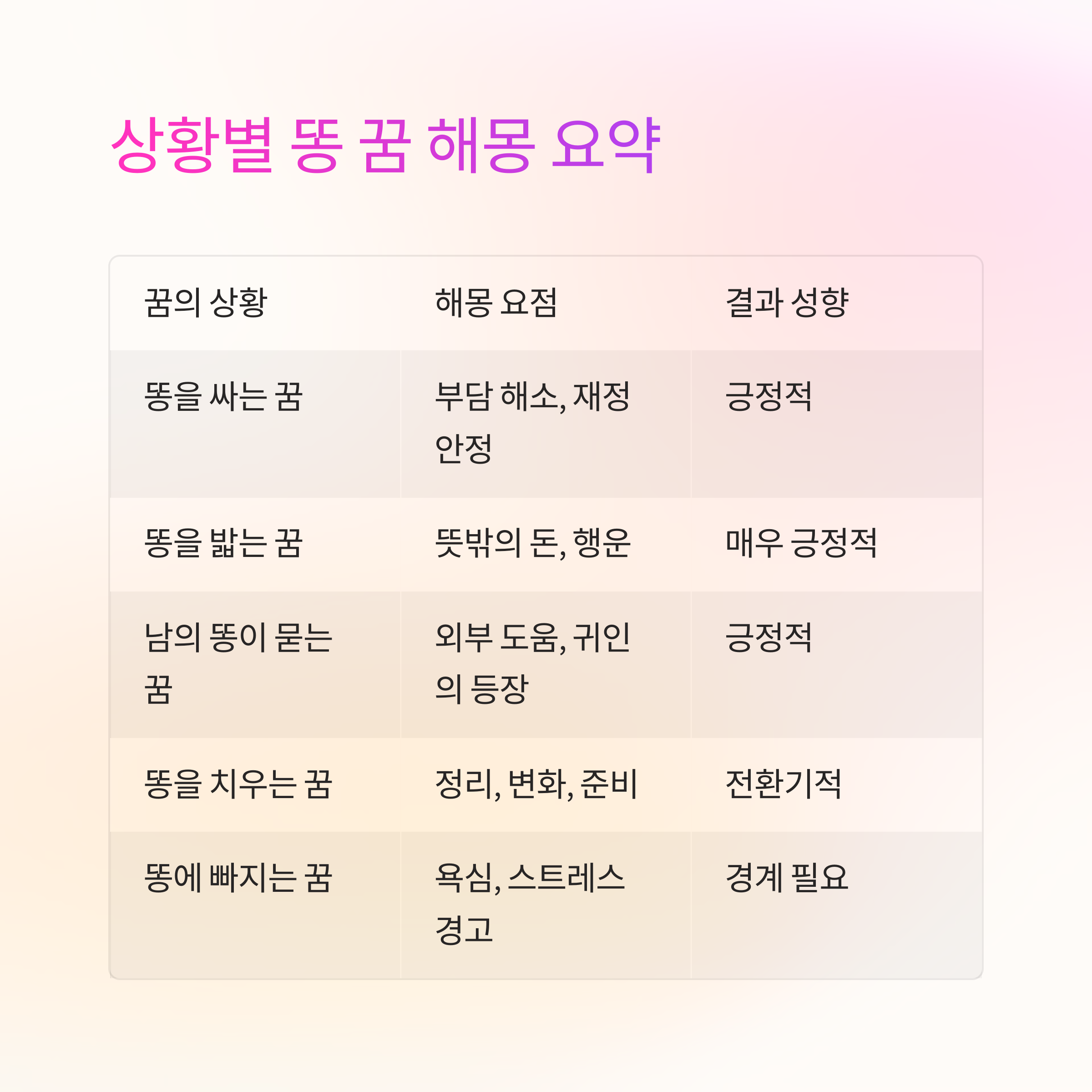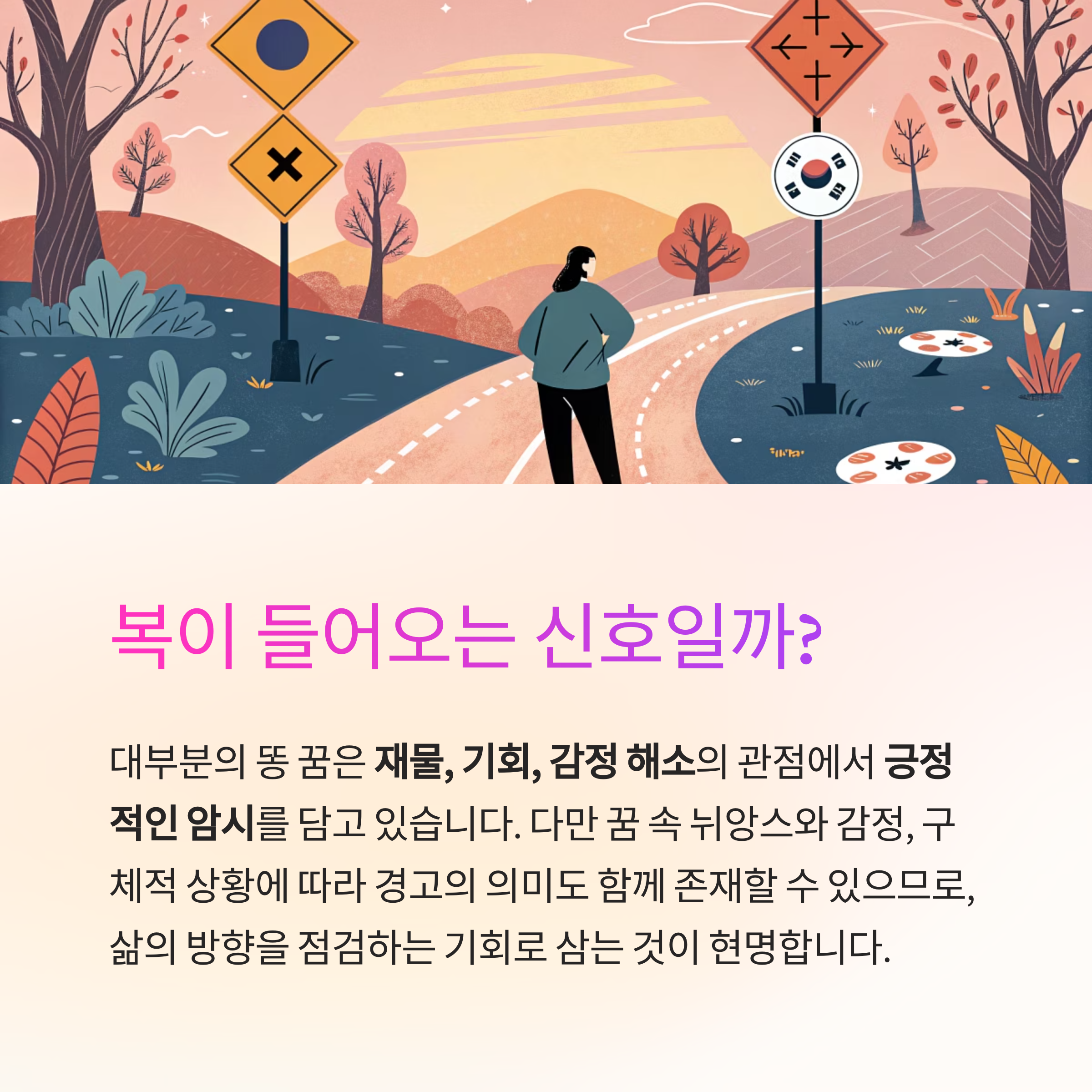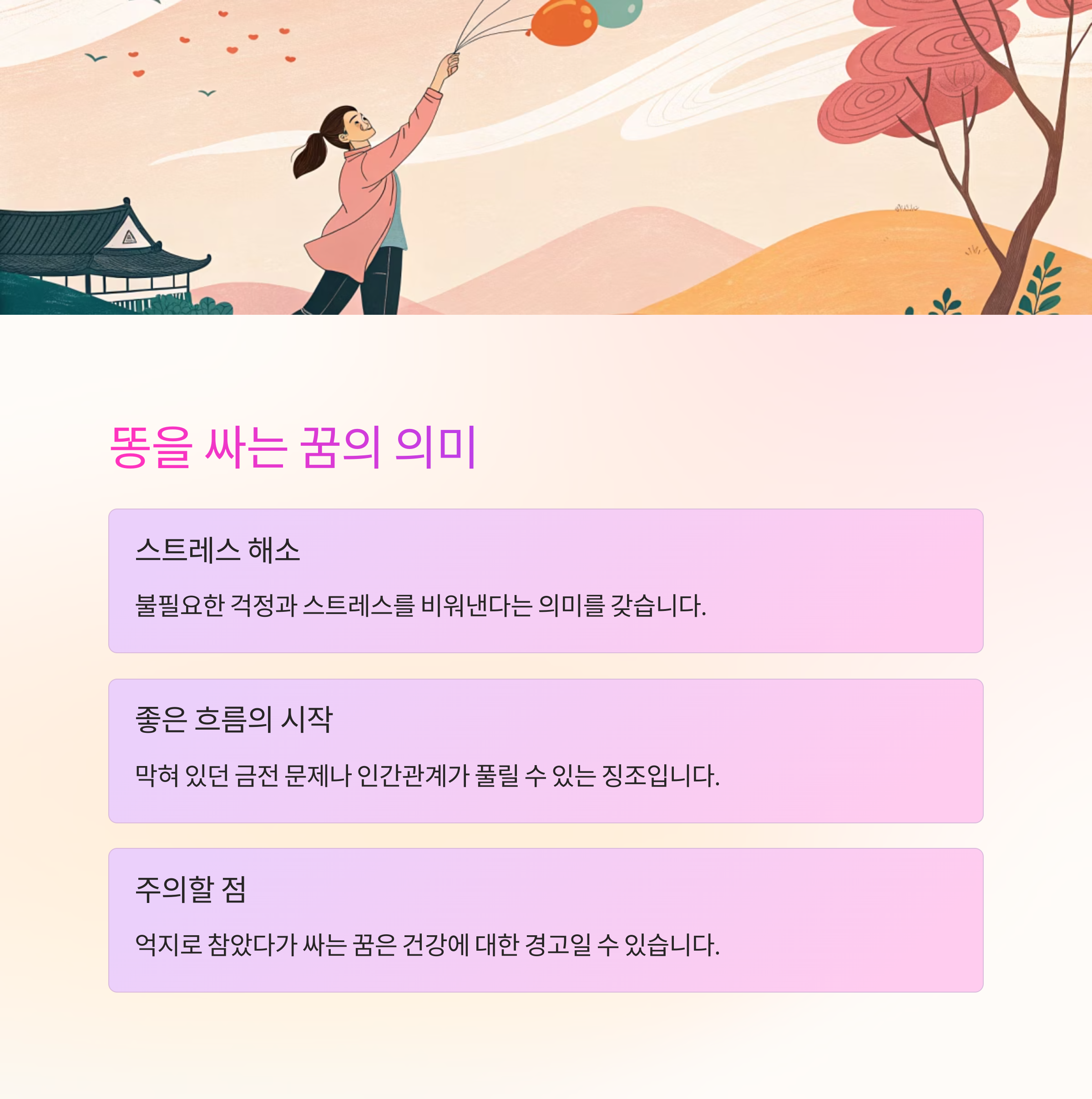 하지만 대부분의 똥 꿈은 재물, 기회, 감정 해소의 관점에서 긍정적인 암시를 담고 있습니다.