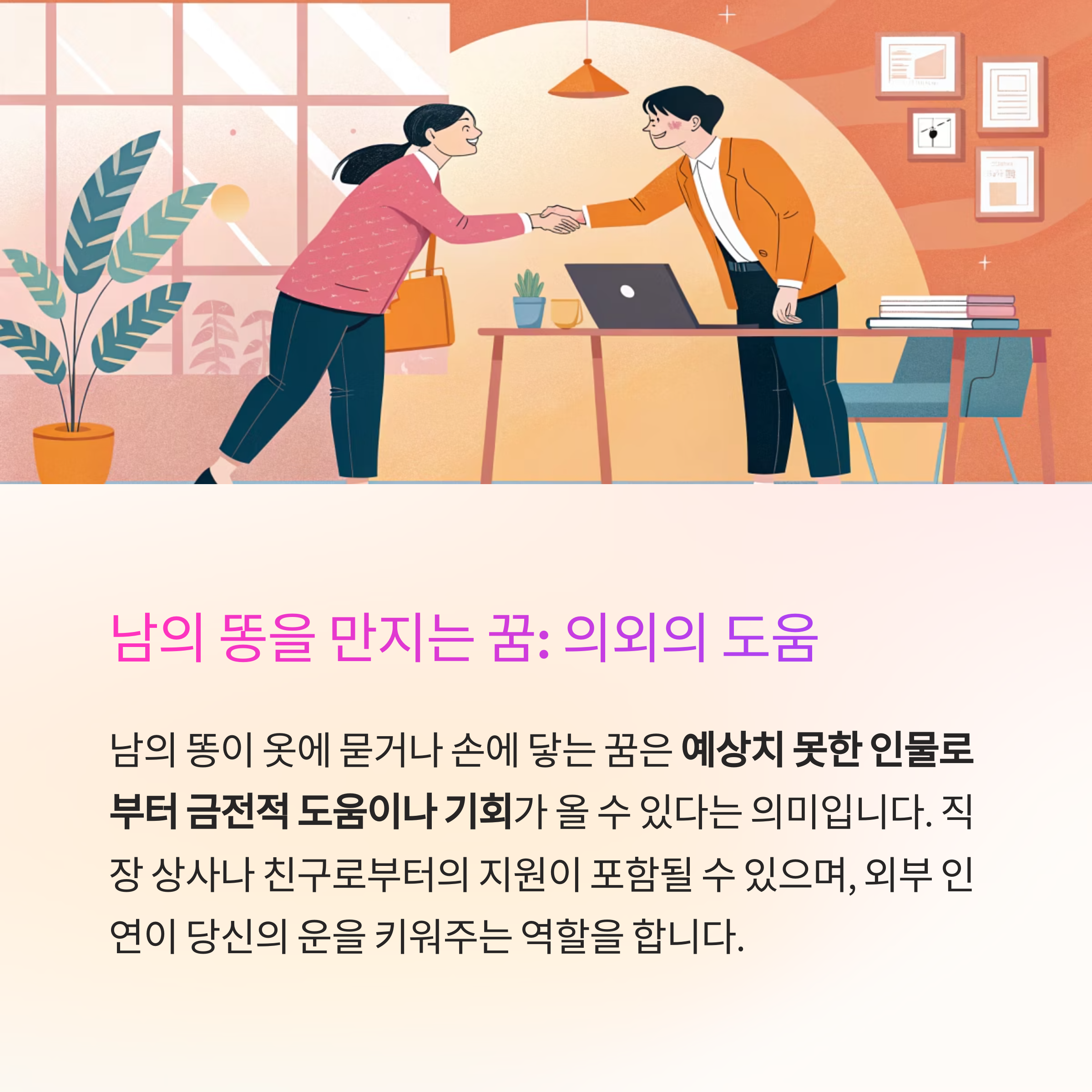 | 남의 똥이 묻는 꿈 | 외부 도움, 귀인의 등장 | 긍정적 |