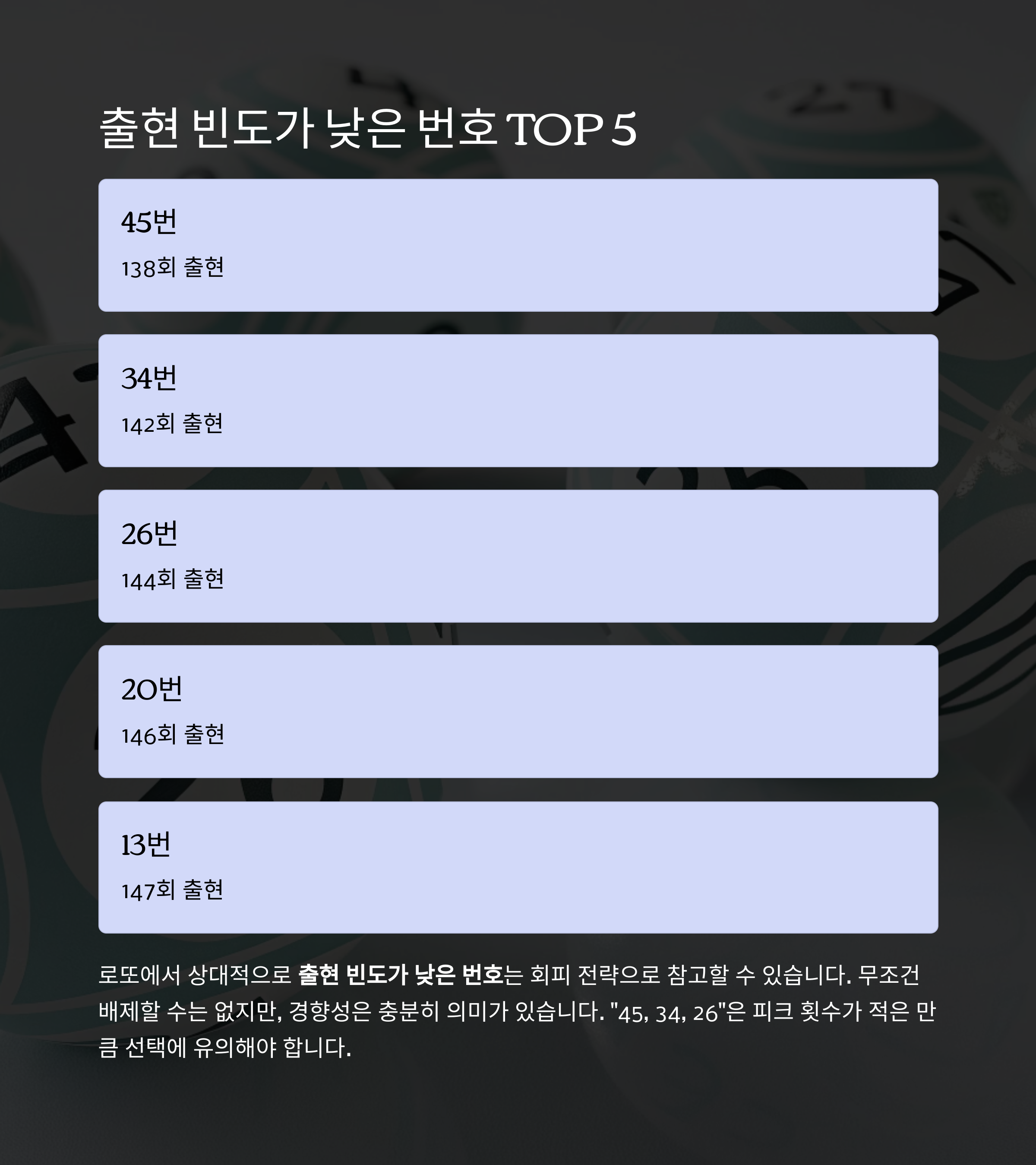 로또에서 상대적으로 출현 빈도가 낮은 번호는 회피 전략으로 참고할 수 있습니다.