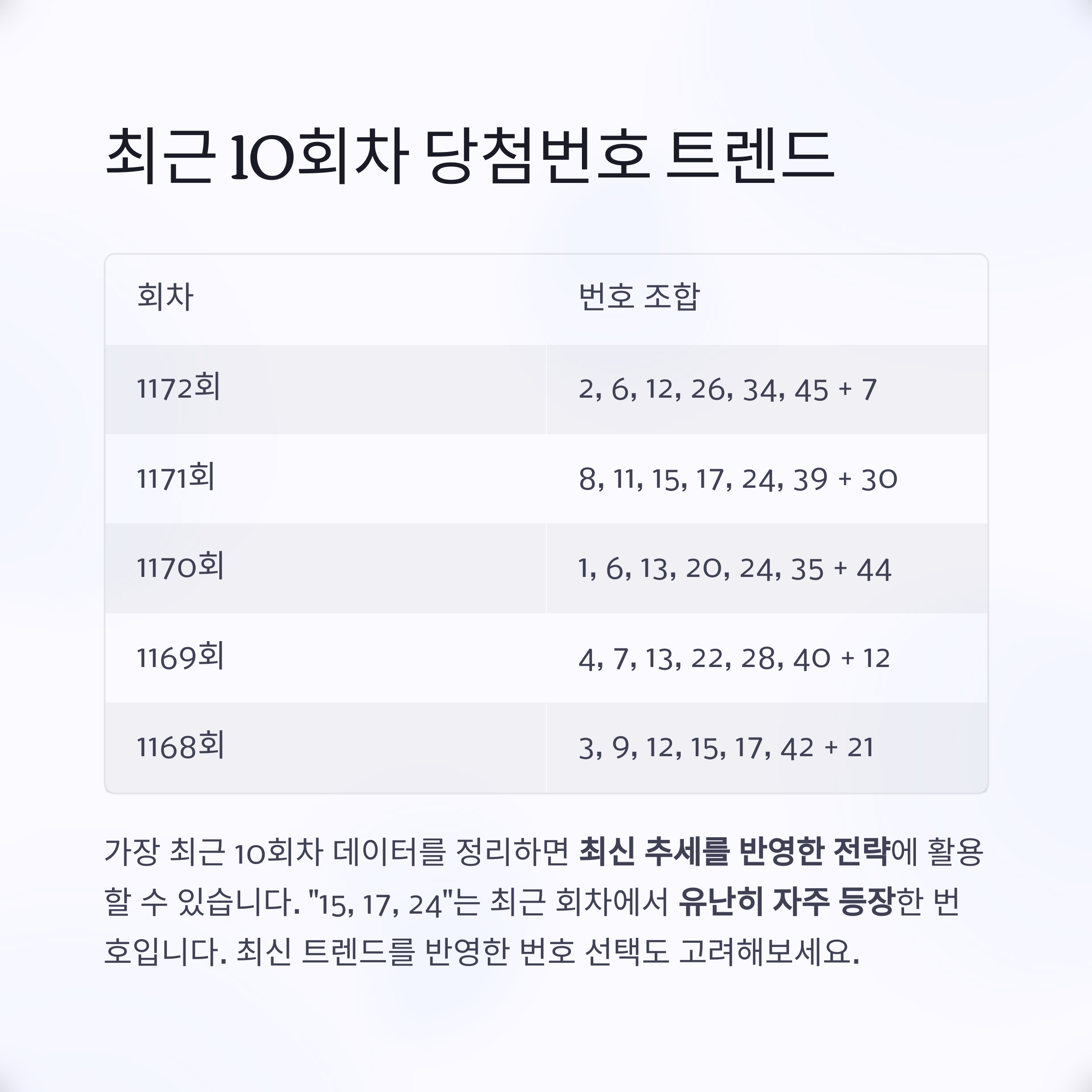 경향성: "15, 17, 24"는 최근 회차에서 유난히 자주 등장한 번호입니다.