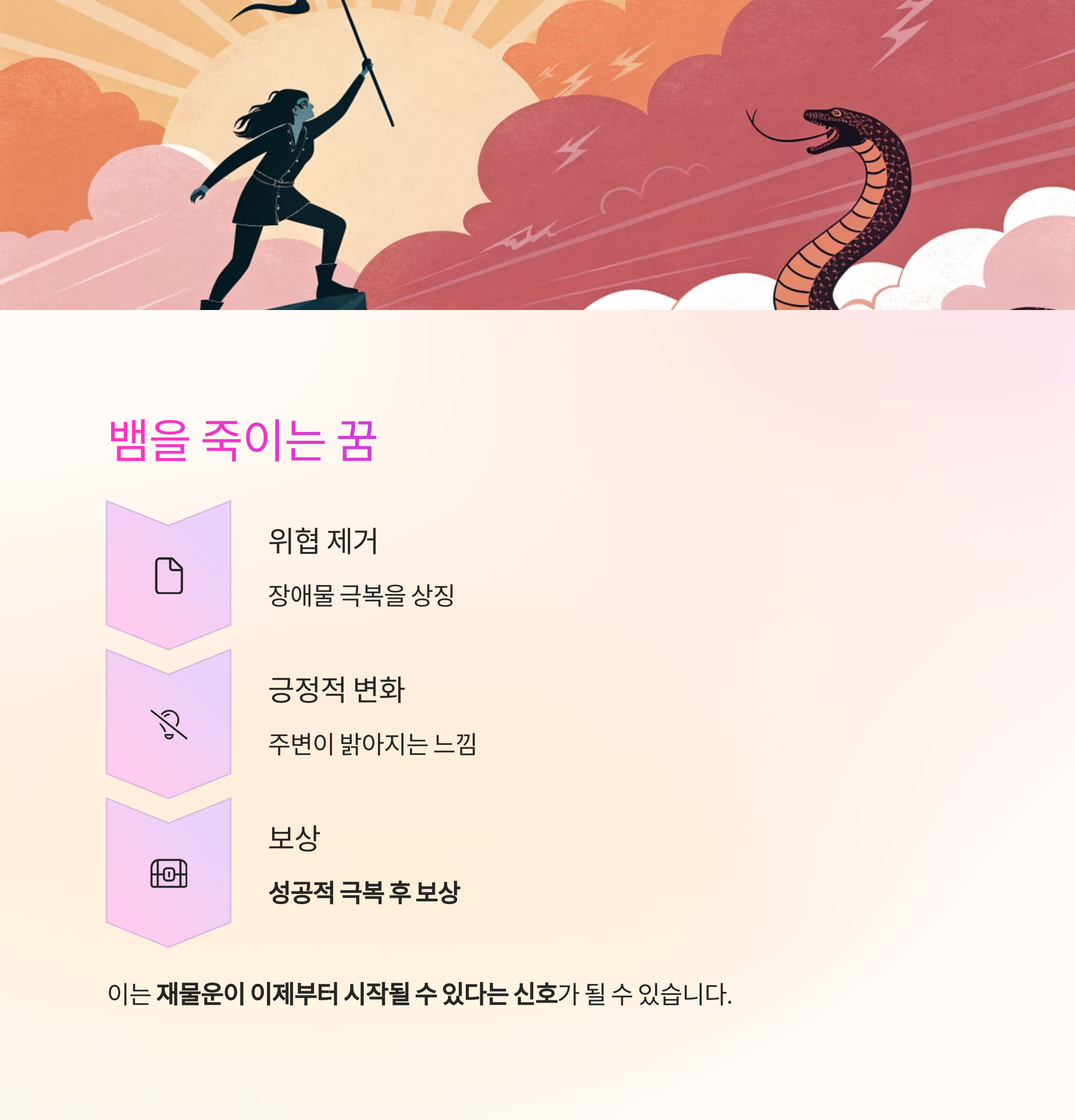 | 뱀을 죽임 | 위협 제거 후 기회 등장 | 중간~높음 |
