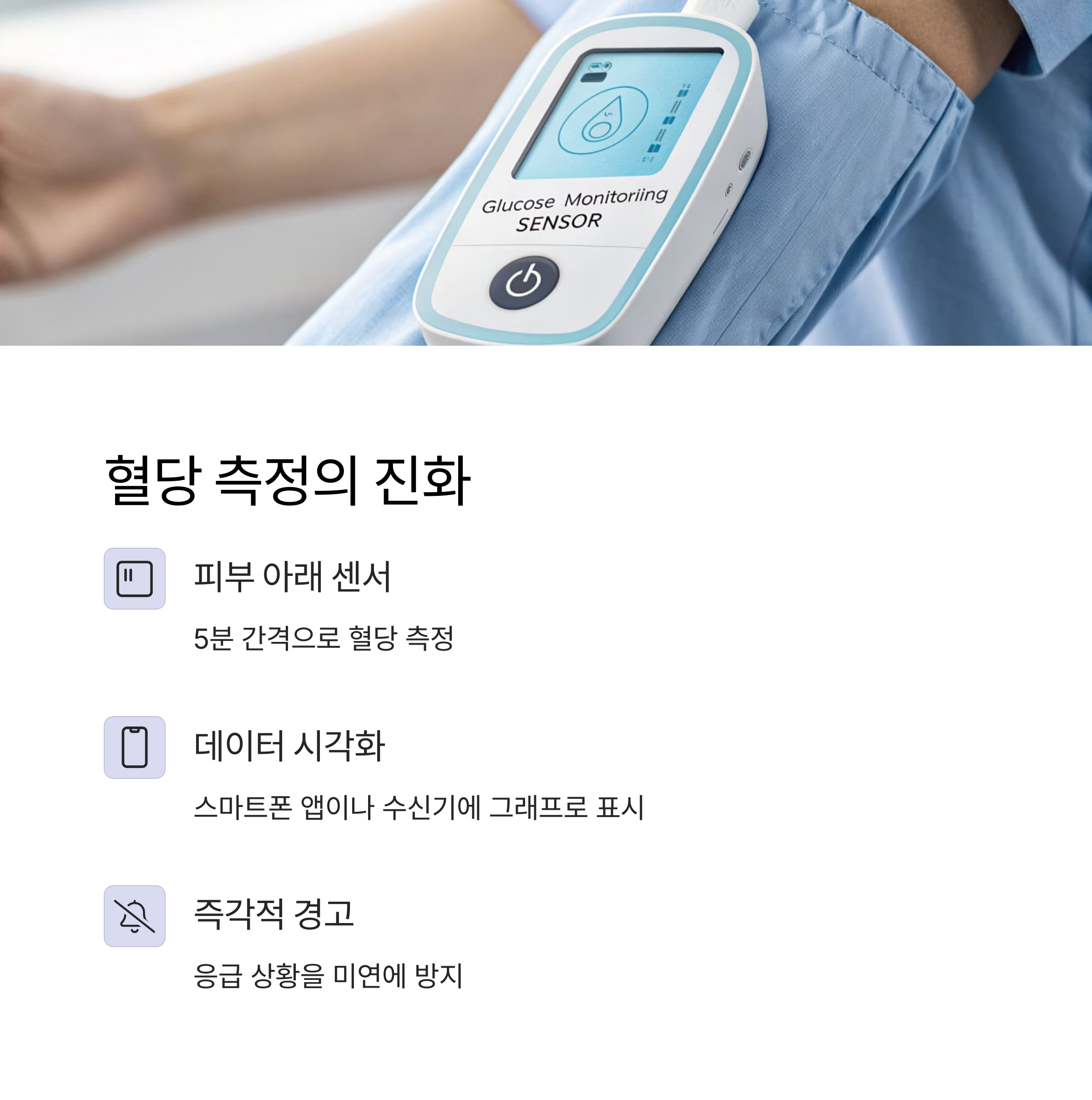 이 정보는 스마트폰 앱이나 수신기에 전송되어 그래프로 시각화되며, 고혈당과 저혈당을 사전에 인지할 수 있습니다.