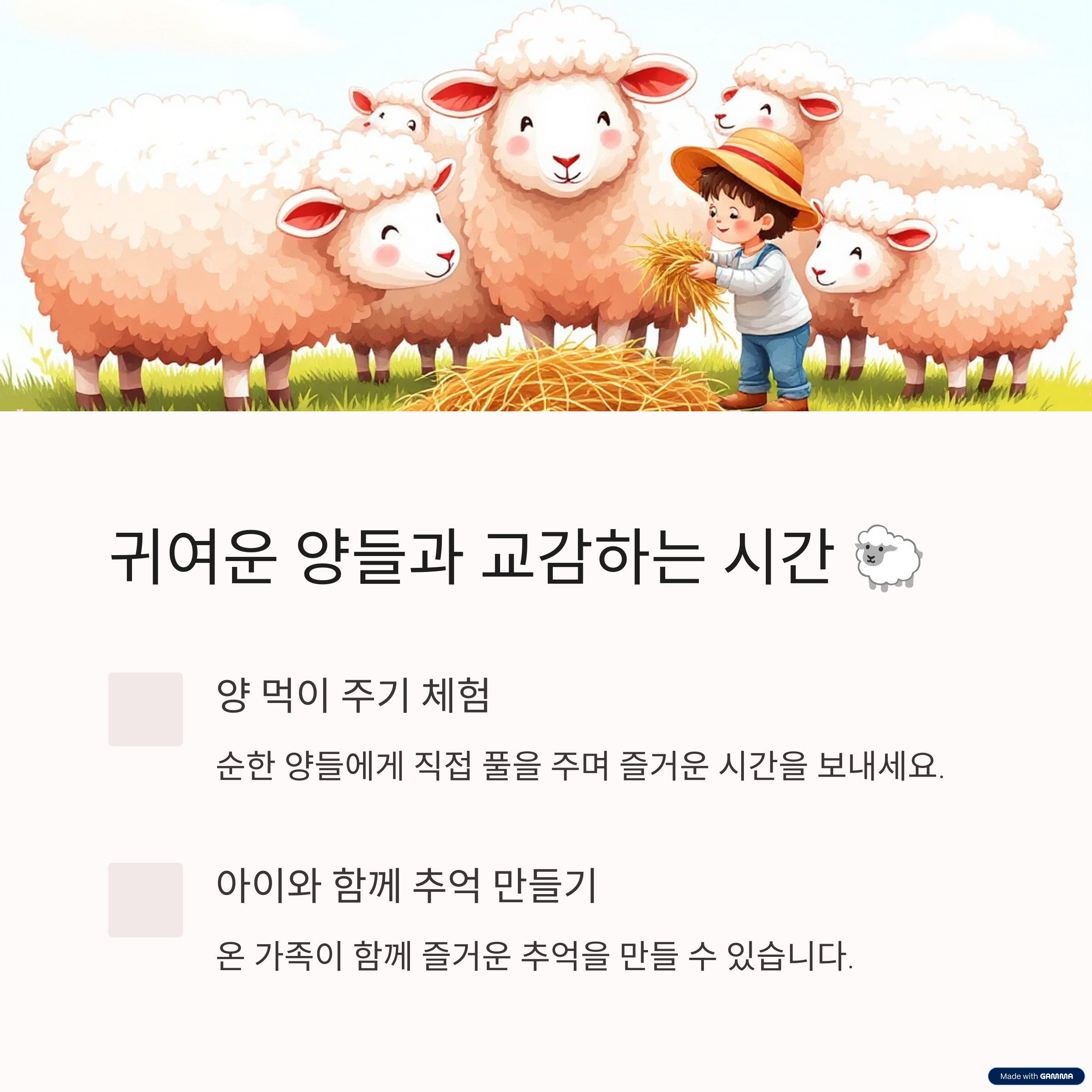 치즈 체험은 아직 운영되지 않지만, 양에게 먹이주기 체험은 어린이 동반 가족에게 만족도가 높습니다.