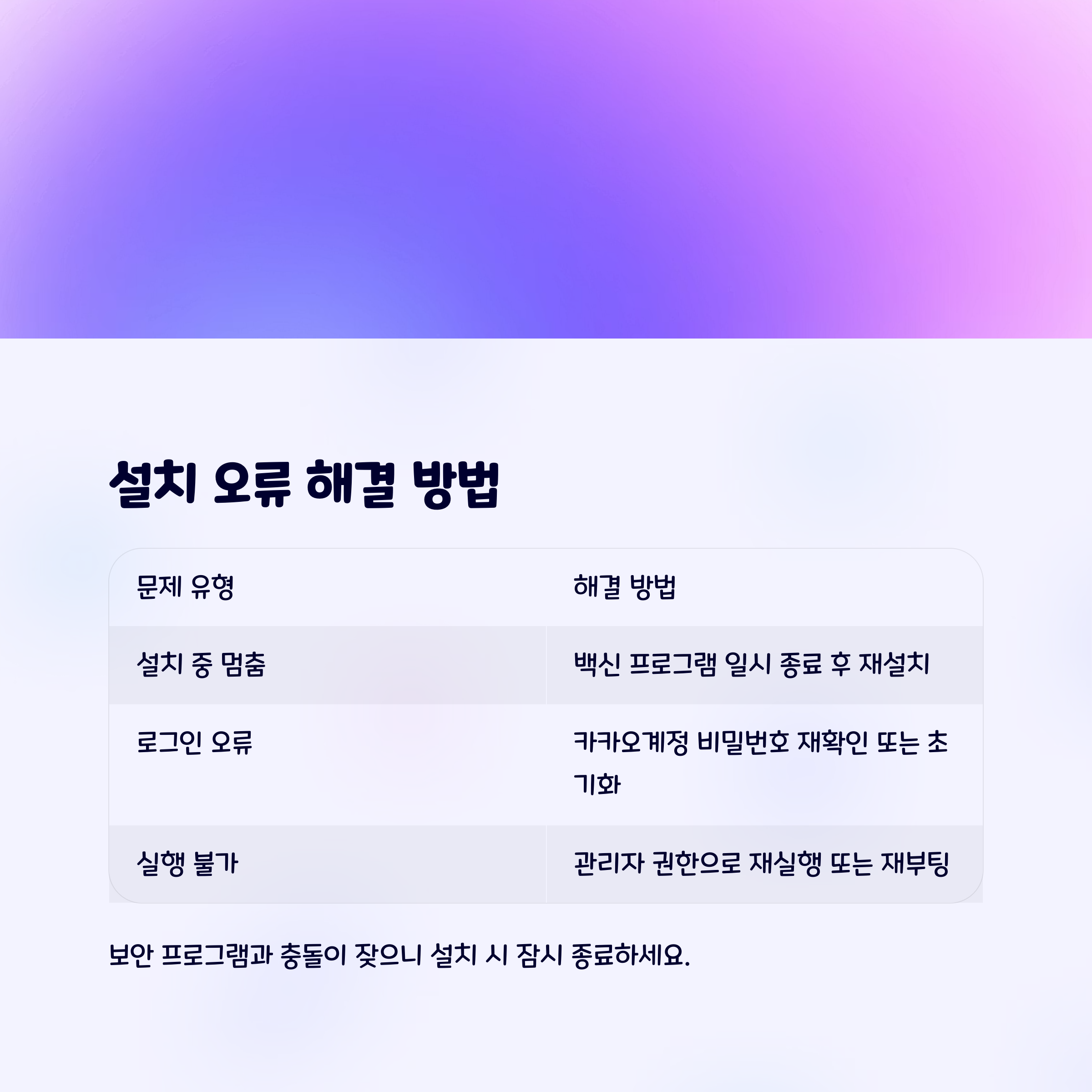 | 설치 중 멈춤 | 백신 프로그램 일시 종료 후 재설치 |