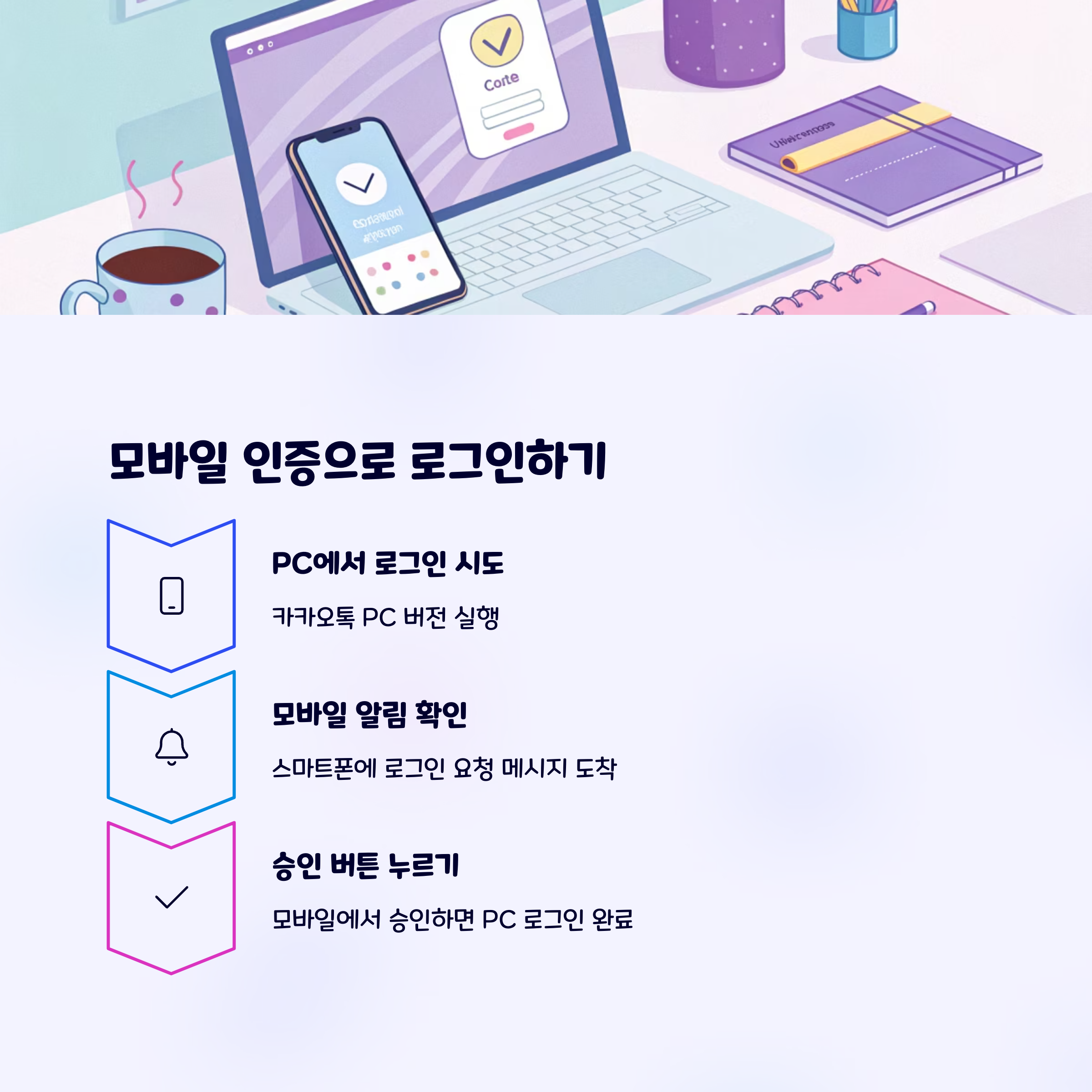 스마트폰에 설치된 카카오톡 앱에서 로그인 요청 메시지가 오면, 승인을 눌러야 PC버전 로그인이 완료됩니다.