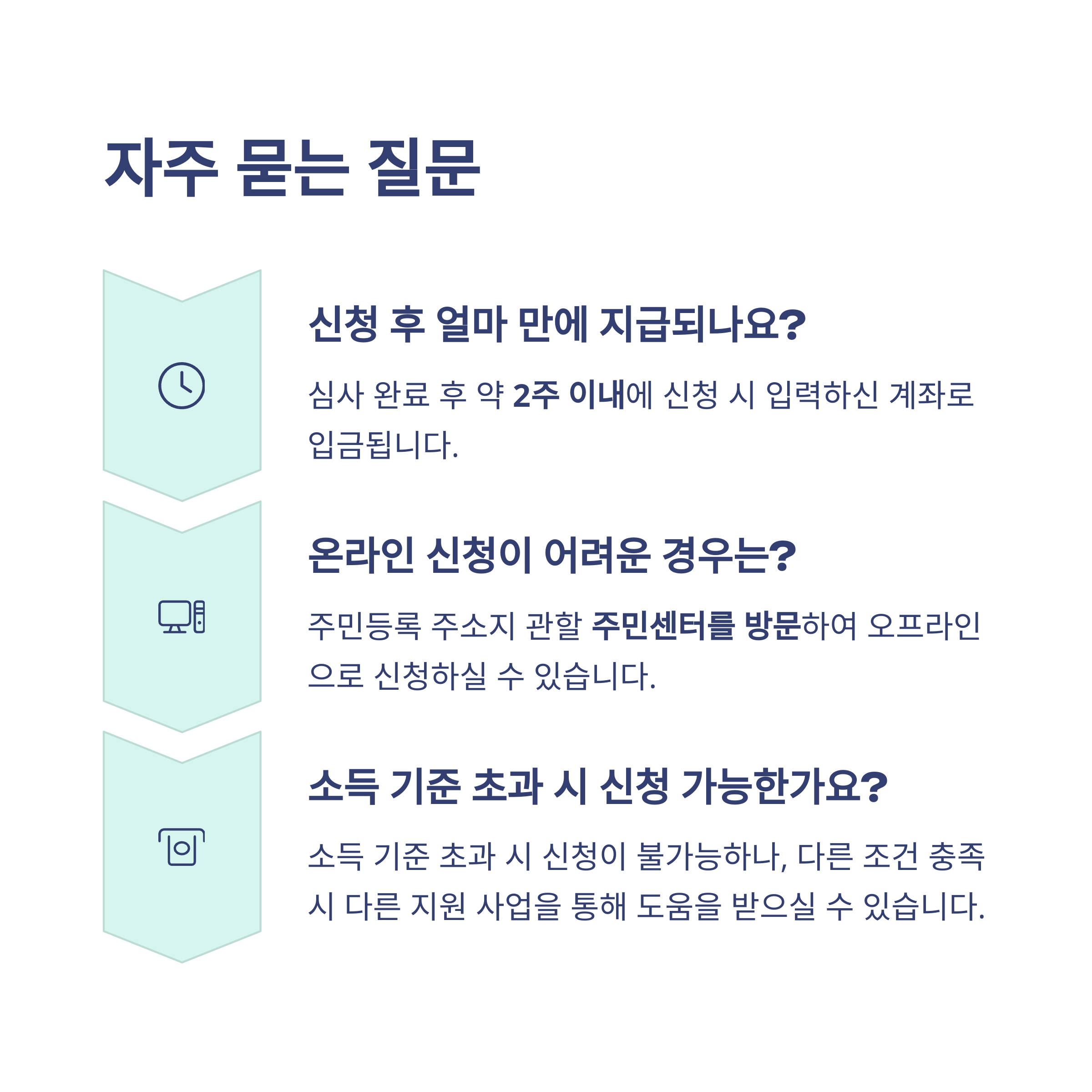 A2: 온라인 신청이 어려우신 분들은 주민등록 주소지 관할 주민센터를 방문하여 오프라인으로 신청하실 수 있습니다. 주민센터에서는 신청 절차에 대한 안내와 도움을 제공합니다.