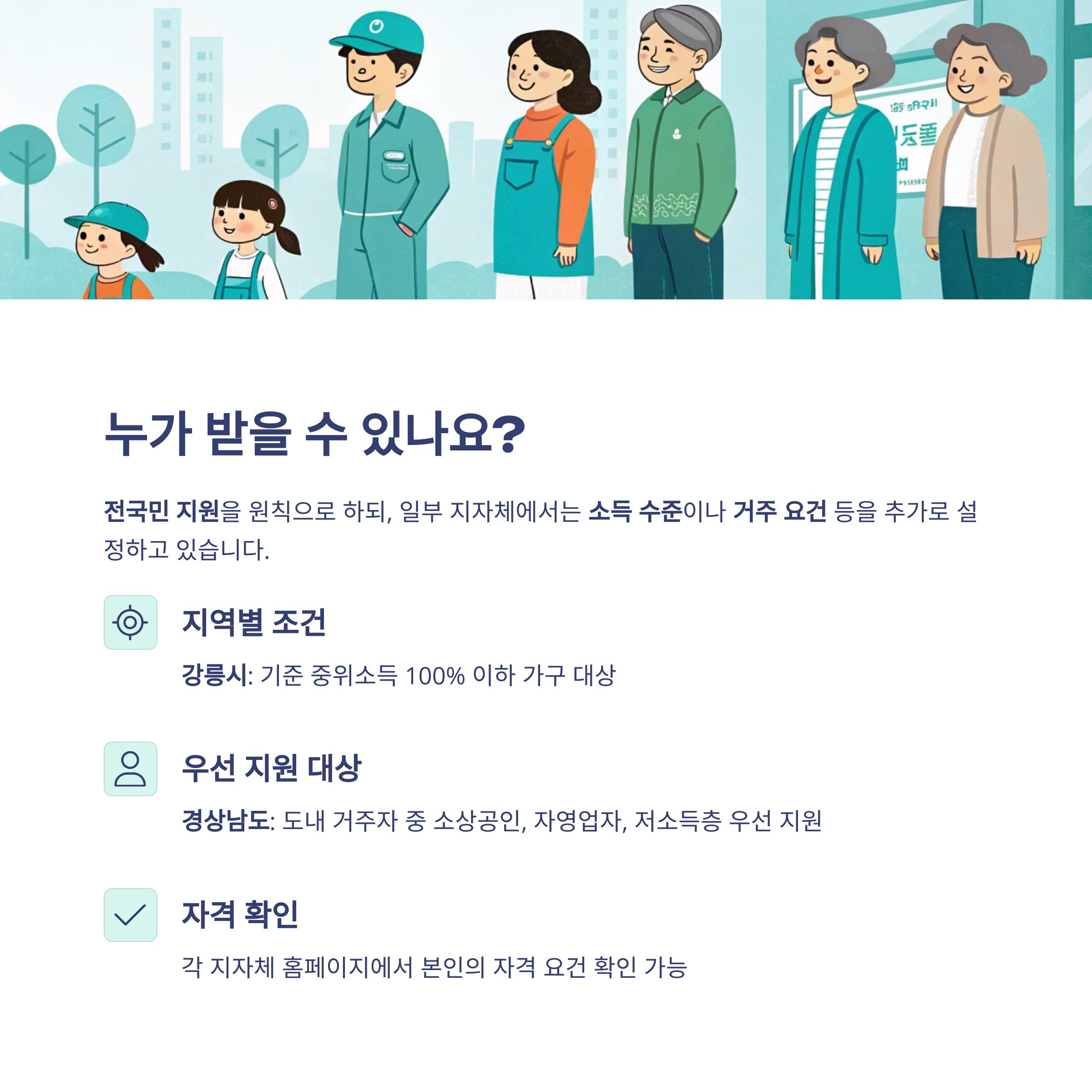 전국민 지원을 원칙으로 하되, 일부 지자체에서는 소득 수준이나 거주 요건 등을 추가로 설정하고 있습니다. 예를 들어, 강릉시는 기준 중위소득 100% 이하 가구를 대상으로 하며, 경상남도는 도내 거주자 중 소상공인, 자영업자, 저소득층 등을 우선 지원합니다.