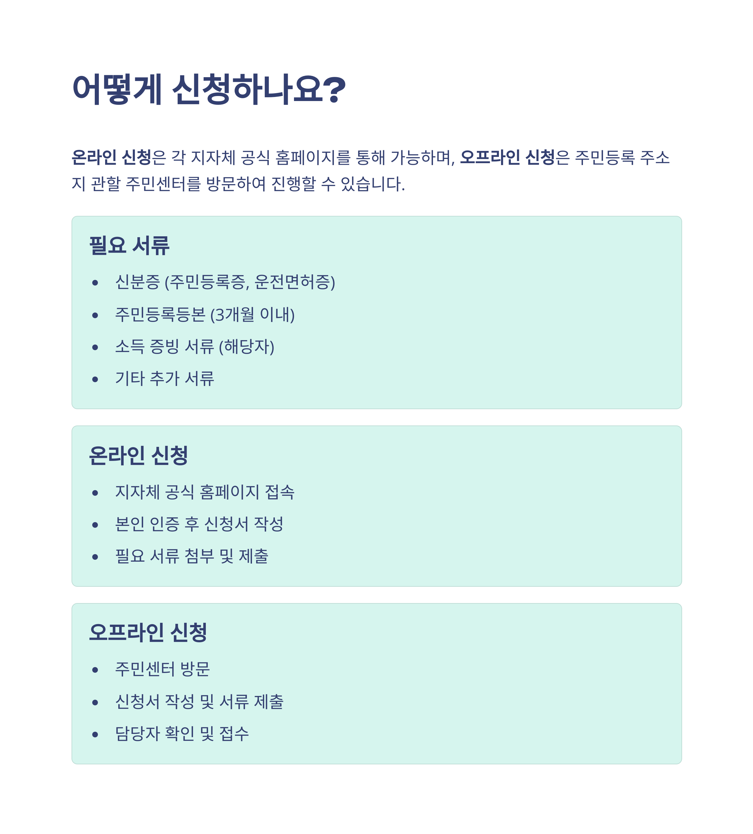 온라인 신청은 각 지자체 공식 홈페이지를 통해 가능하며, 오프라인 신청은 주민등록 주소지 관할 주민센터를 방문하여 진행할 수 있습니다. 신청 시 필요한 서류는 다음과 같습니다: