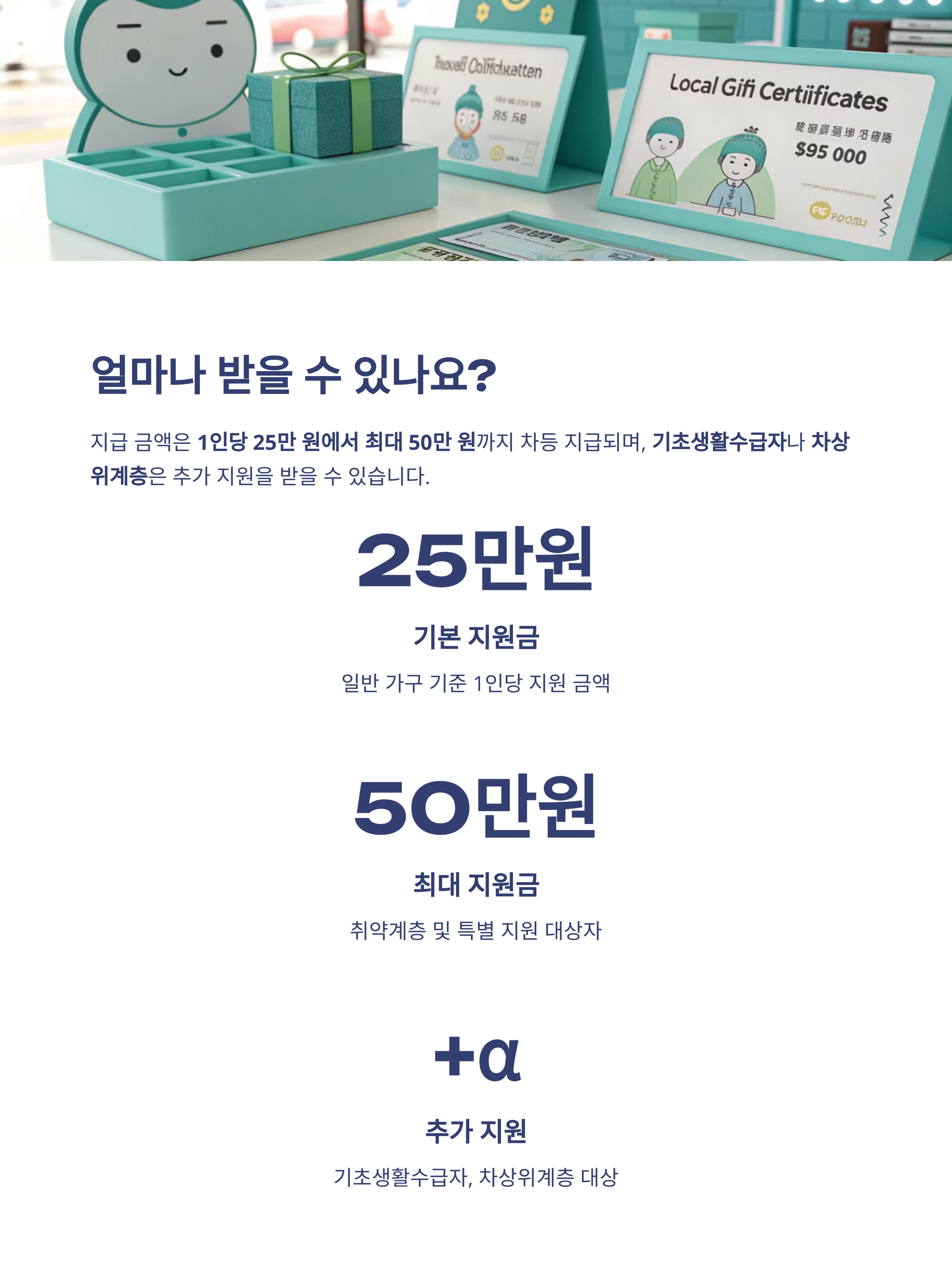 지급 금액은 1인당 25만 원에서 최대 50만 원까지 차등 지급되며, 기초생활수급자나 차상위계층은 추가 지원을 받을 수 있습니다. 지급 방식은 지역사랑상품권이나 선불카드 등으로 제공되며, 일부 지역에서는 현금 지급도 선택 가능합니다.