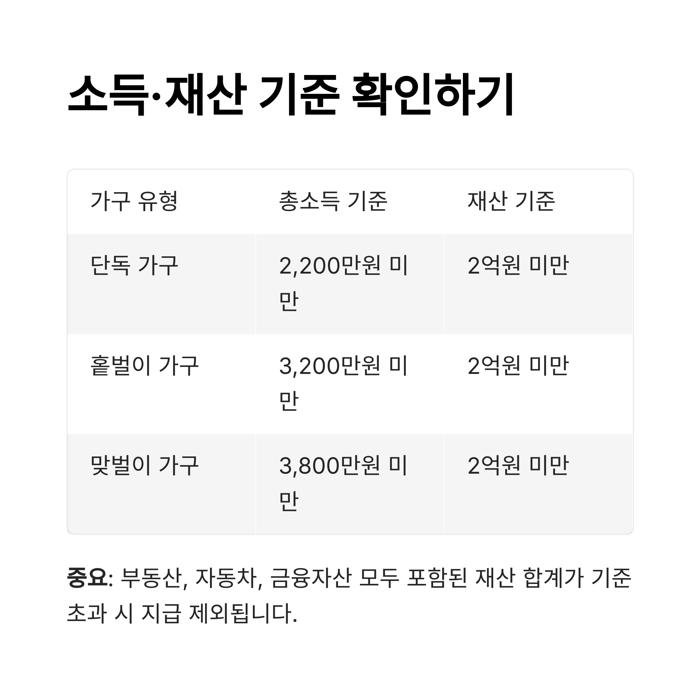 중요: 부동산, 자동차, 금융자산까지 모두 포함된 재산 합계가 기준 초과 시 지급 제외됩니다.