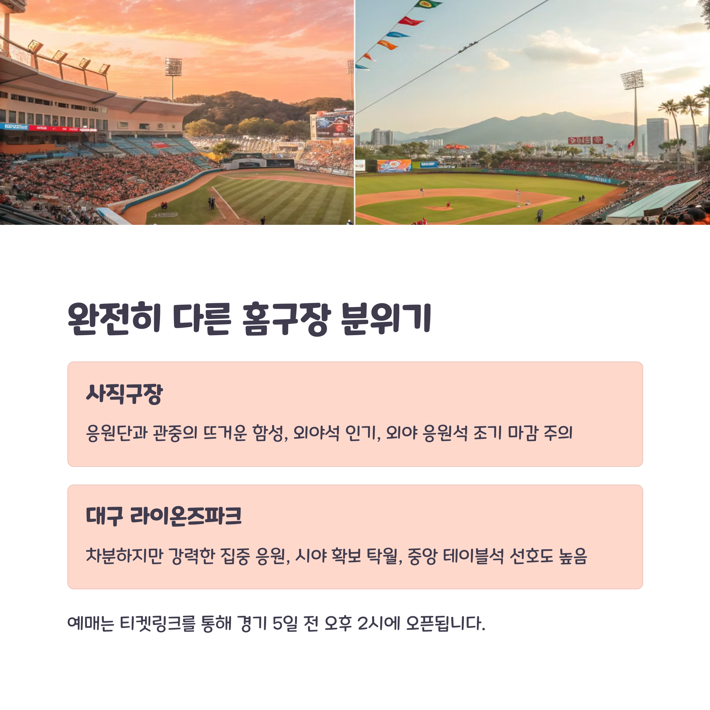 | 사직구장 | 단체 응원 강세, 외야석 인기 | 외야 응원석 조기 마감 주의 |