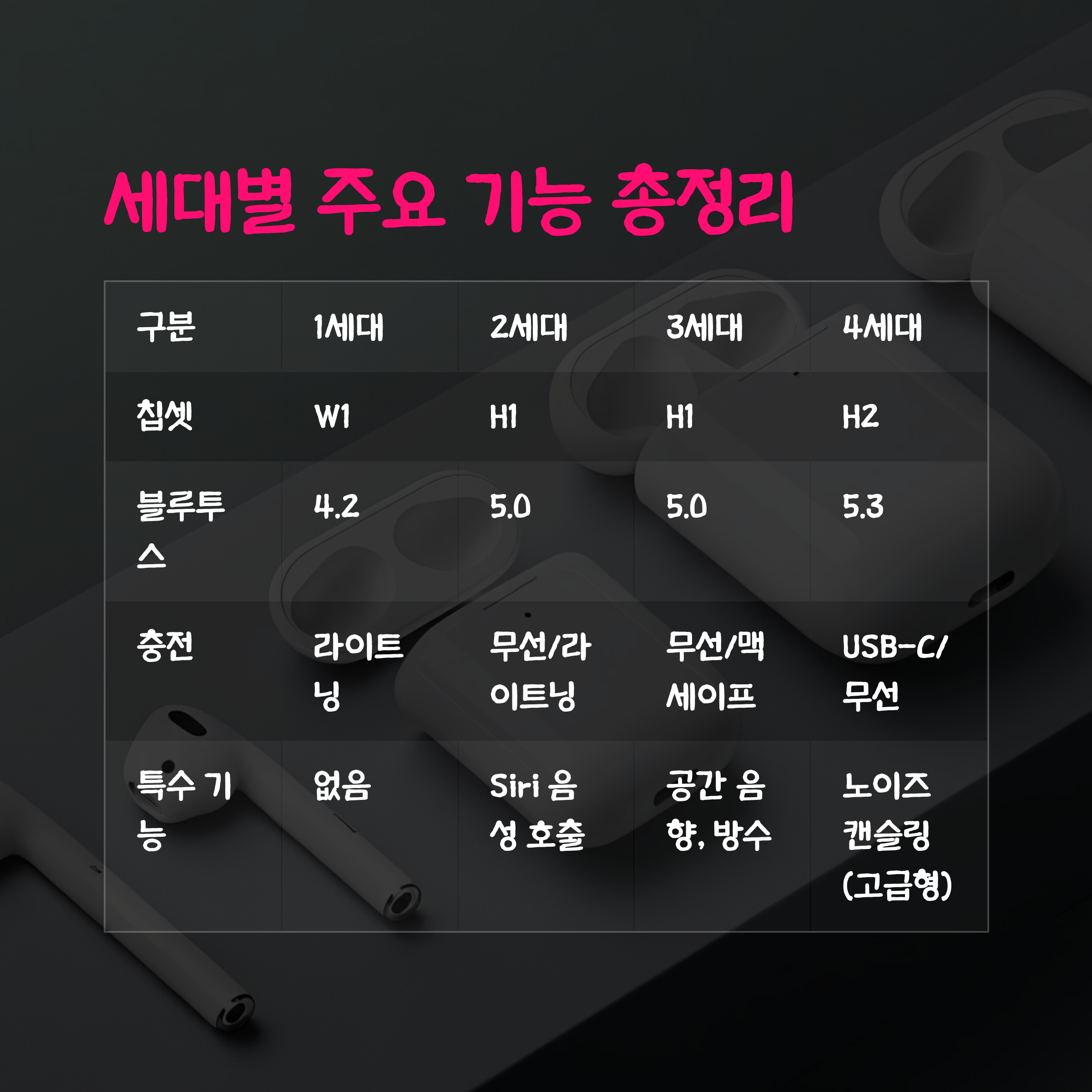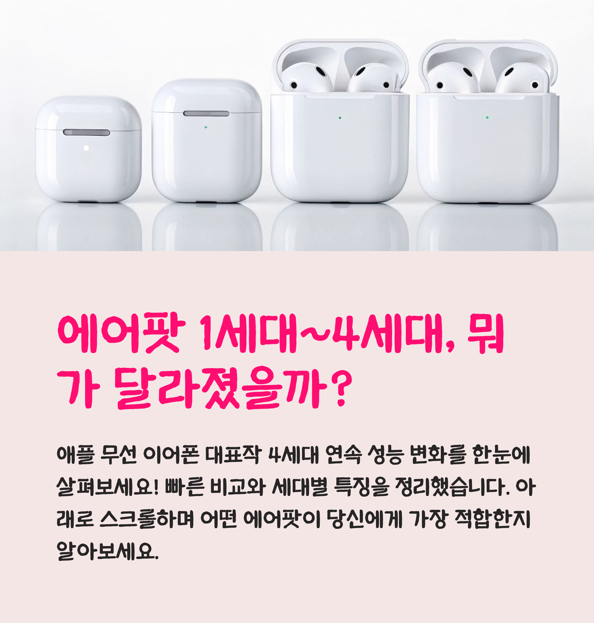 에어팟 1세대부터 4세대까지 성능 차이를 비교해드립니다. 빠르게 제품별 특징을 알고 싶다면 아래 버튼에서 확인하세요.