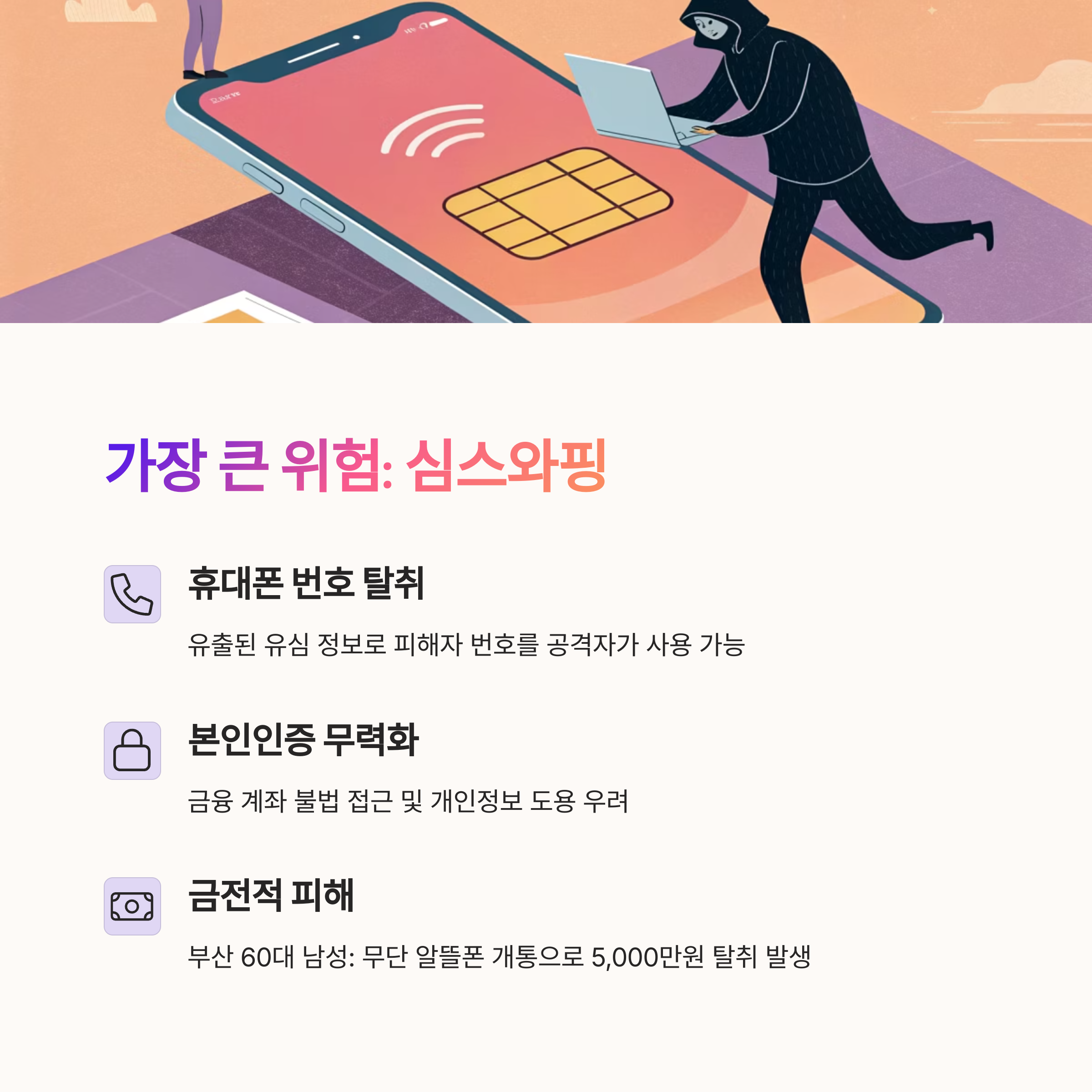 유심 복제가 가능해지면, 내 전화번호를 통해 은행, 본인인증, 각종 앱 서비스 등에 접근할 수 있습니다. 특히 한국처럼 핸드폰 본인인증을 광범위하게 사용하는 환경에서는 계정 탈취, 금융 범죄로 이어질 가능성도 있습니다.